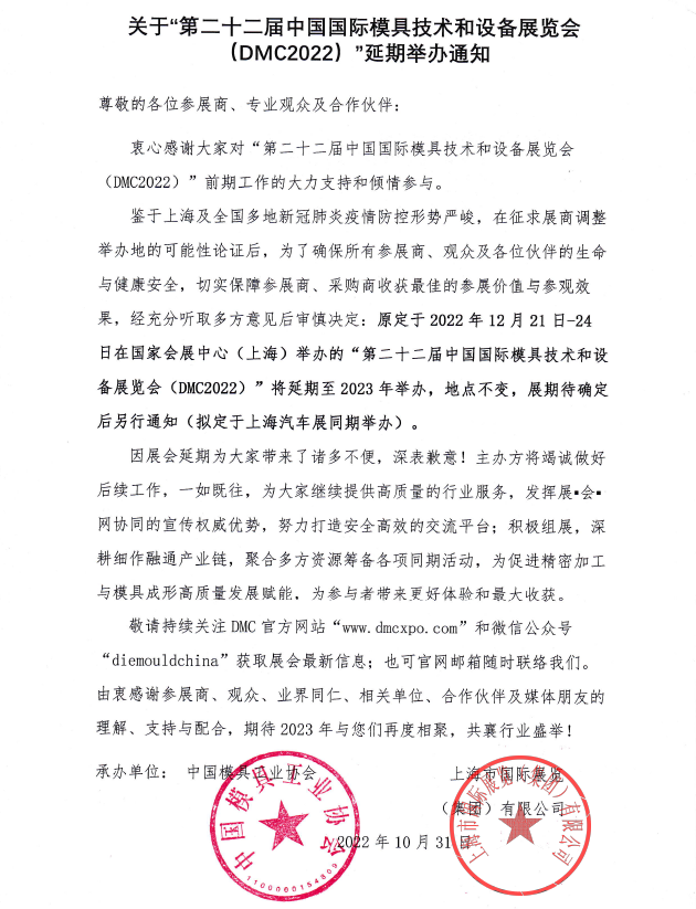 關(guān)于“第二十二屆中國國際模具技術(shù)和設(shè)備展覽會(DMC2022)”延期舉辦通知