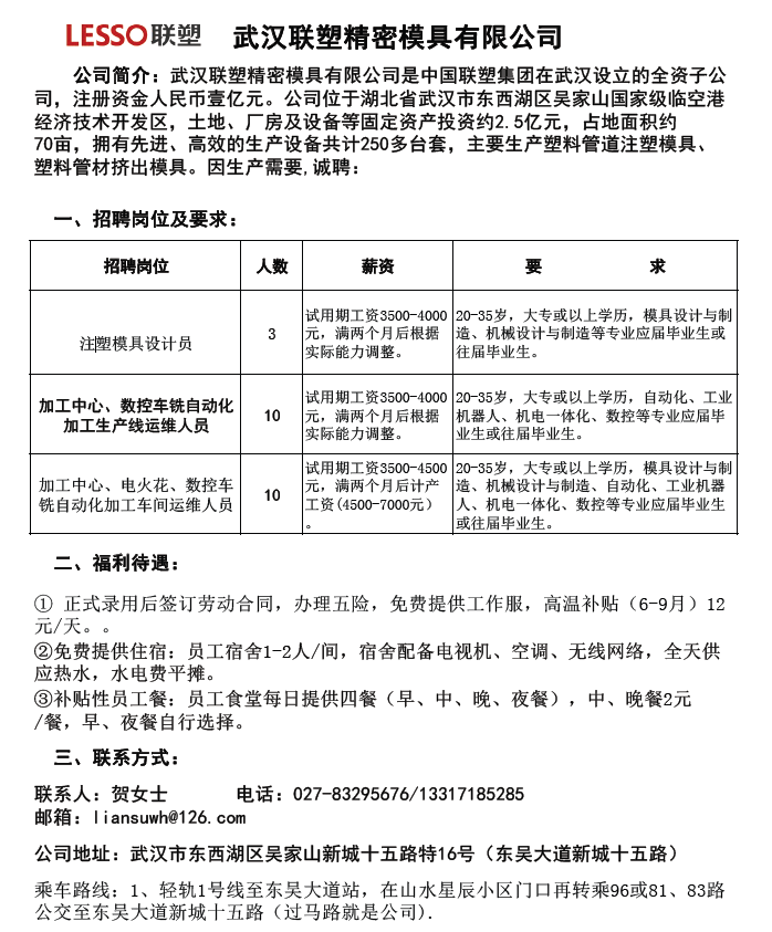 武漢聯(lián)塑精密模具有限公司 2023年招聘信息