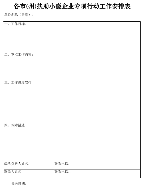 請各地認(rèn)真填報《各市(州)扶助小微企業(yè)專項行動工作安排表》(見附件2),于3月25日前報省經(jīng)信委中小企業(yè)發(fā)展處。