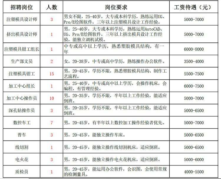 武漢聯(lián)塑精密模具有限公司是聯(lián)塑集團(tuán)在武漢設(shè)立的全資子公司,注冊資金人民幣壹億元。公司位于湖北省武漢市東西湖區(qū)吳家山國家級臨空港經(jīng)濟(jì)技術(shù)開發(fā)區(qū),土地、廠房及設(shè)備等固定資產(chǎn)投資約1.8億元,占地面積70多畝,擁有先進(jìn)、高效的生產(chǎn)設(shè)備共計200多臺套,主要生產(chǎn)注塑模具、塑料管材擠出模具,F(xiàn)因生產(chǎn)需要,誠聘: