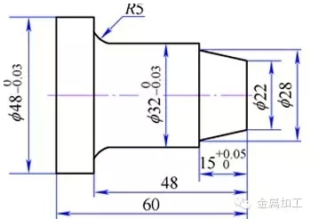 “/”是FANUC系統(tǒng)中的一個(gè)特殊的編程指令,它要求編寫在一個(gè)程序段的最前端,它的功能是當(dāng)程序運(yùn)行到該段時(shí)跳過(guò)執(zhí)行下一段而不執(zhí)行該段,因此該指令稱為跳步指令。但跳與不跳不僅取決于程序段中是否有該指令,而且還取決于操作面板上的跳步功能鍵是否有效,如果跳步功能鍵有效,則執(zhí)行到該段時(shí)就跳;如果跳步功能鍵無(wú)效,則該指令就相當(dāng)于一個(gè)空指令而不發(fā)揮作用。在實(shí)踐生產(chǎn)中,一般編程人員往往覺得該指令沒有什么用而忽略它的價(jià)值,下面向大家介紹一種在數(shù)控加工中巧用該指令的方法。編程車削加工如圖1所示的零件。