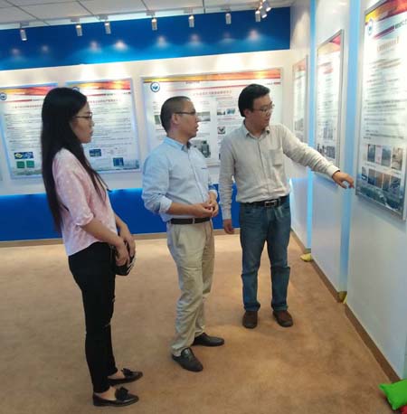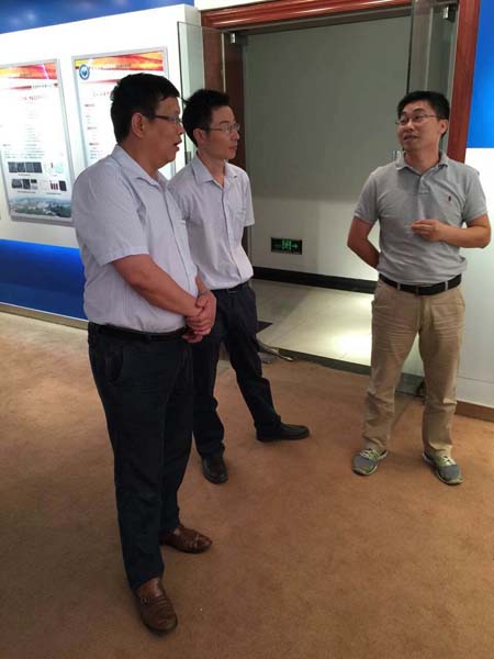 楊總和馬經(jīng)理與實(shí)驗(yàn)室黃博士在展廳交流