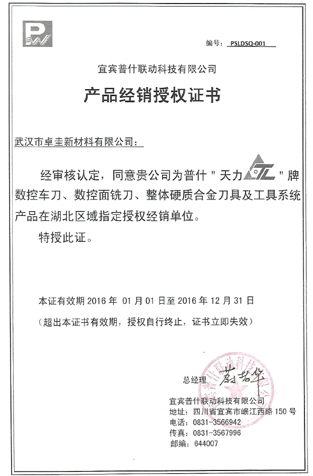 公司是宜賓五糧液集團(tuán)普什聯(lián)動科技股份有限公司“天力”牌刀具湖北地區(qū)總經(jīng)銷商。宜賓普什聯(lián)動科技有限公司主要生產(chǎn)“天力”牌整體硬質(zhì)合金刀具、數(shù)控可轉(zhuǎn)伴刀具、工具系統(tǒng)等,同時從事航空零部件、柴油機(jī)機(jī)體和其它國外大中型機(jī)械零部件機(jī)械加工。公司主要客戶包括康明斯、通用電氣、卡麥龍、中船重工、東方電氣、二重、沈飛、西飛等。