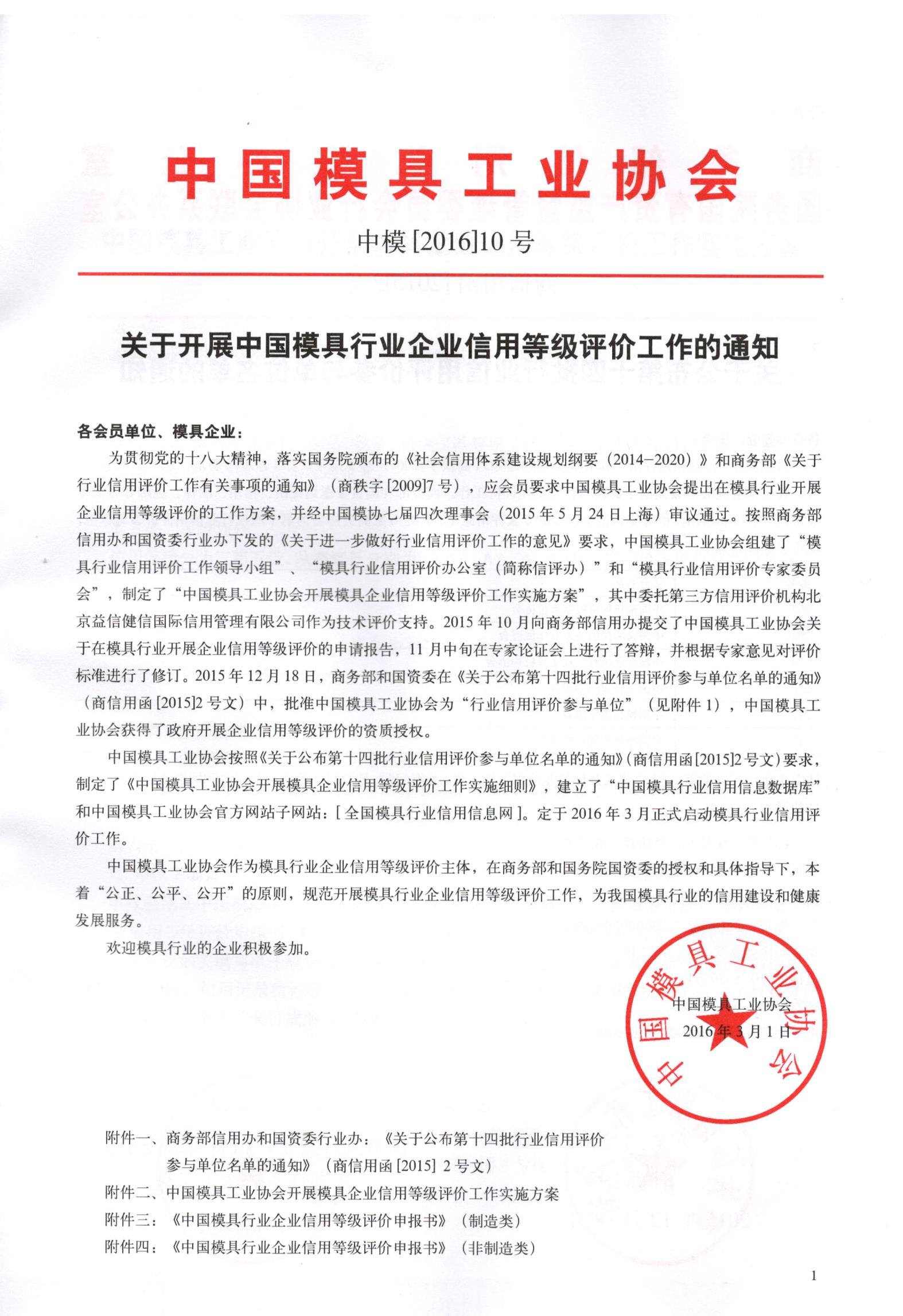 轉(zhuǎn)發(fā)中國模協(xié)《關(guān)于開展中國模具行業(yè)企業(yè)信用等級評價工作的通知》