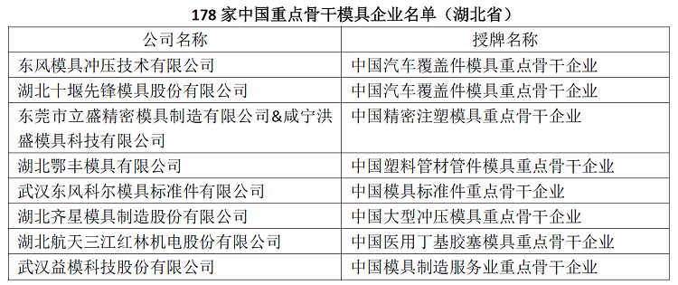在公示名單中,湖北模具界有東風(fēng)模沖等8家企業(yè)入選,如下表所示。178家中國重點(diǎn)骨干模具企業(yè)名單(完整版),可登陸中國模協(xié)網(wǎng)站http://www.cdmia.com.cn/news/detail/3378.html查看。