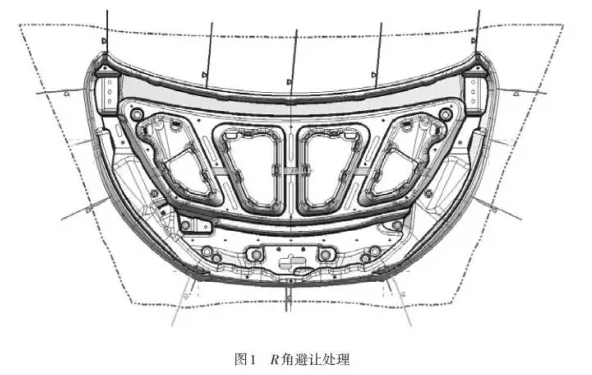 (1)一般凹R圓角重新倒角為R-2mm,凸R圓角重新倒角為R+2mm,如圖1中粗線區(qū)域(原則上R≧15mm及R≤3mm的凹圓角不做避空處理)。