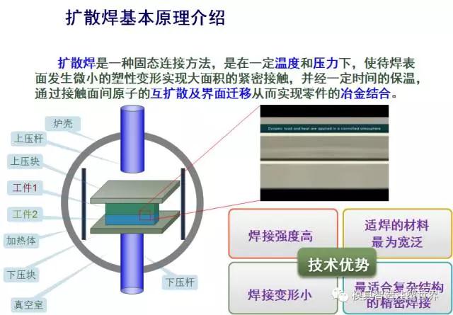 擴散焊的上述機理決定了該方法具有獨特的技術(shù)優(yōu)勢,如:焊接強度高、適焊材料范圍廣、焊接變形小、特別適用于復(fù)雜結(jié)構(gòu)的精密焊接。