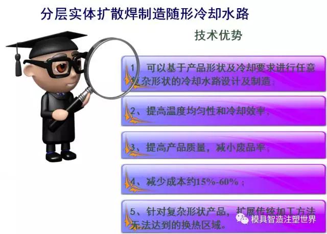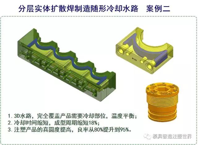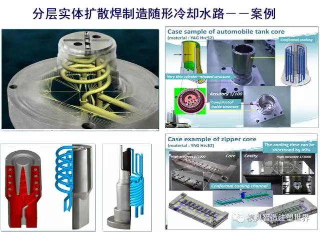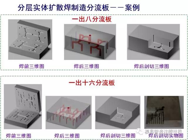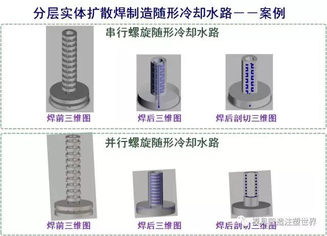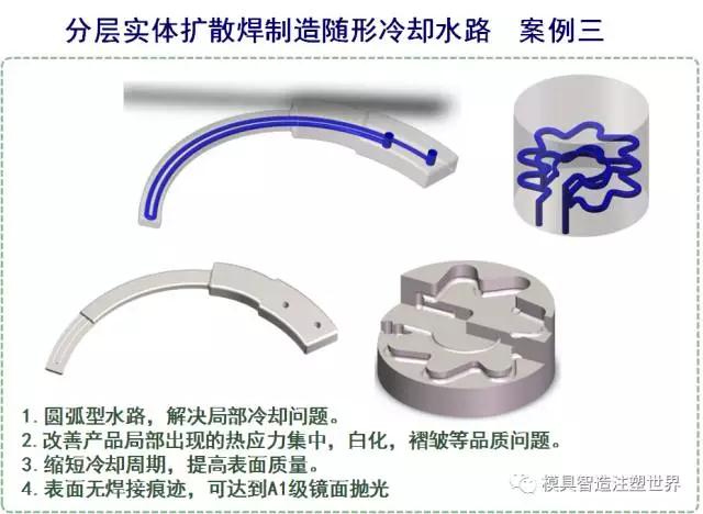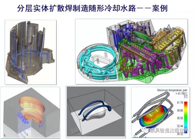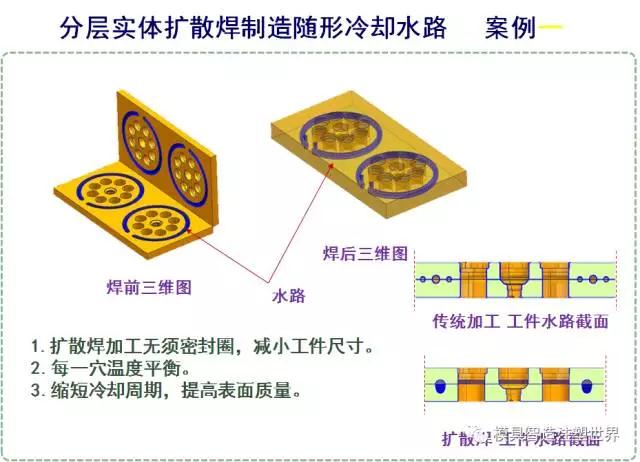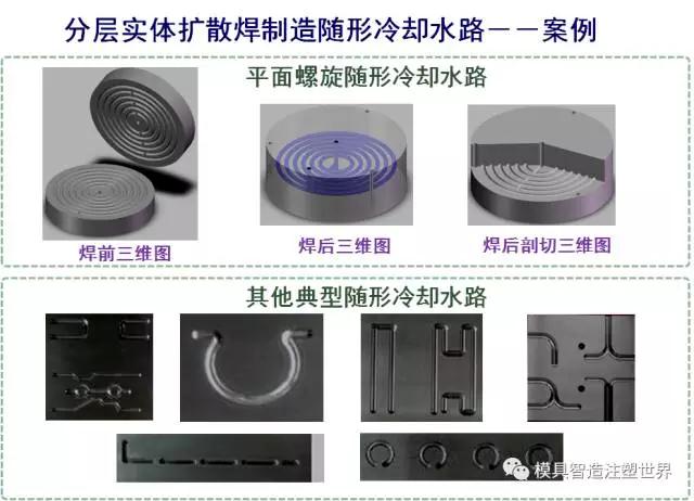 現(xiàn)代模具行業(yè)中,為滿足產(chǎn)品尺寸精度以及成本控制的要求,對于模具冷卻提出了更高的要求,分層實體擴散焊方法憑借其在復(fù)雜結(jié)構(gòu)產(chǎn)品制造方面的技術(shù)優(yōu)勢,被應(yīng)用于隨形冷卻水路的制造領(lǐng)域,其具有5點技術(shù)優(yōu)勢,分別為:1 可以基于產(chǎn)品形狀及冷卻要求進行任意復(fù)雜形狀的冷卻水路設(shè)計及制造;2 提高溫度均勻性和冷卻效率;3 減少成本約15%-60%;4 提高產(chǎn)品質(zhì)量,減小廢品率;5 針對復(fù)雜形狀產(chǎn)品,擴展傳統(tǒng)加工方法無法達到的換熱區(qū)域。