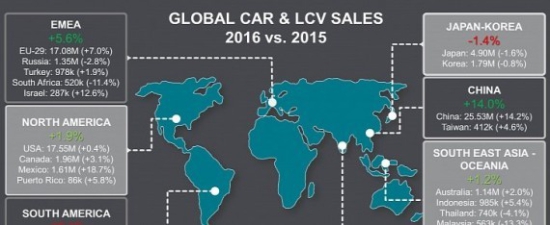 英國權(quán)威汽車調(diào)研公司JATO Dynamics近日公布了2016年全球汽車銷量,總量達8424萬輛,同比增長5.6%。