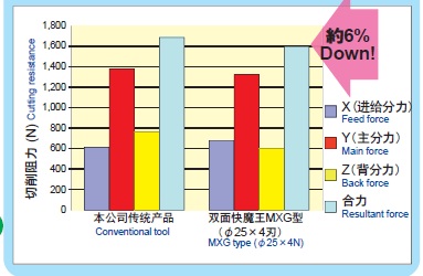 與本公司傳統(tǒng)的正前角型刀具相比,其切削阻力降低。這就是優(yōu)化刃口形狀,把切削厚度降低了14%的表現(xiàn)。同時,也是負(fù)角型刀片采用正前角的設(shè)計,降低了切削阻力的成功事例。