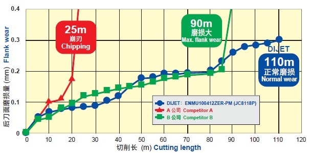 圖5為雙面快魔王及A公司、B公司的雙面高進給型刀具的壽命比較。A公司刀盤加工25m后刀片大面積崩刃,B公司刀盤加工90m后,刀片后刀面大面積磨損,不能再繼續(xù)使用。雙面快魔王加工長度長達110m,另一方面可看出,加工不銹鋼時熱傳導(dǎo)率低,產(chǎn)生的切削熱會容易集中在刀具刃口部,加速刀具的磨損,導(dǎo)致刀具壽命短等問題。而雙面快魔王同其他公司相比,壽命更長,且磨損進度也是穩(wěn)定緩慢的。