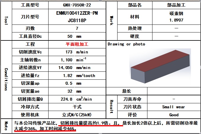 碳素鋼零部件的平面粗加工中,介紹使用雙面快魔王(GMX-7050R-22:φ50X7刃),改善加工效率的事例。