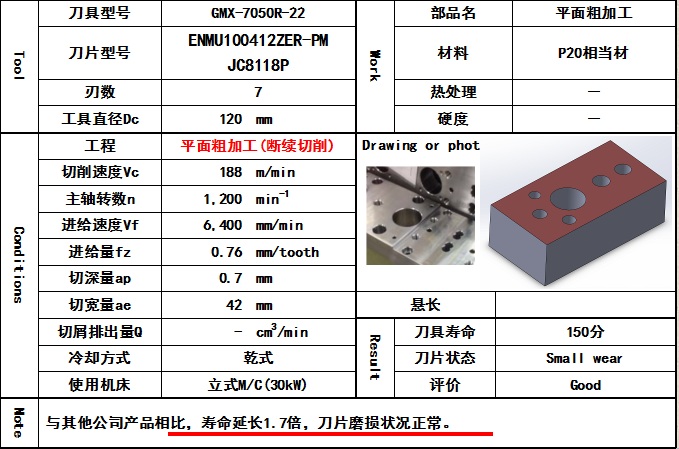 相當(dāng)P20材料的模具平面粗加工中,介紹使用雙面快魔王(GMX-7050R-22:φ50X7刃),與其他公司產(chǎn)品相比實現(xiàn)長壽命的加工事例。