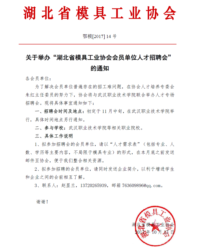 關于舉辦“湖北省模具工業(yè)協(xié)會會員單位人才招聘會”的通知
