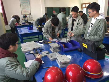 2018年3月9日,在武漢市第二輕工業(yè)學校國家級模具實訓基地車工車間、鉗工車間, 2015級模具專業(yè)三十八名學生正在進行緊張的車工、鉗工實操技能考核,本次考核是模具專業(yè)中職學生進入高職學院的轉段考核。3月12日至16日,武漢科技大學機械學院機械制造專業(yè)模具方向2014級一百余名學生在專業(yè)老師的帶領下,來到武漢市第二輕工業(yè)學校模具實訓基地進行畢業(yè)設計實習。