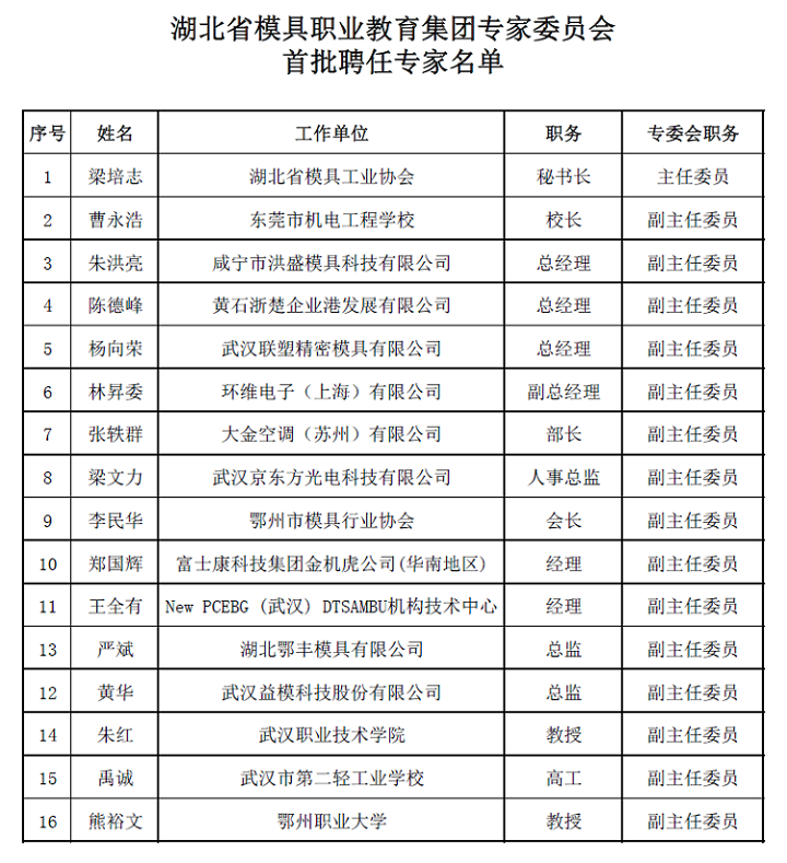 會上,“湖北省模具職教集團專家委員會”舉行了成立儀式,確定了首批專委會專家名單,湖北省模具工業(yè)協(xié)會秘書長梁培志為專委會主任委員,東莞市機電工程學(xué)校校長曹永浩、咸寧市洪盛模具科技有限公司總經(jīng)理朱洪亮等15名專家為專委會副主任委員。