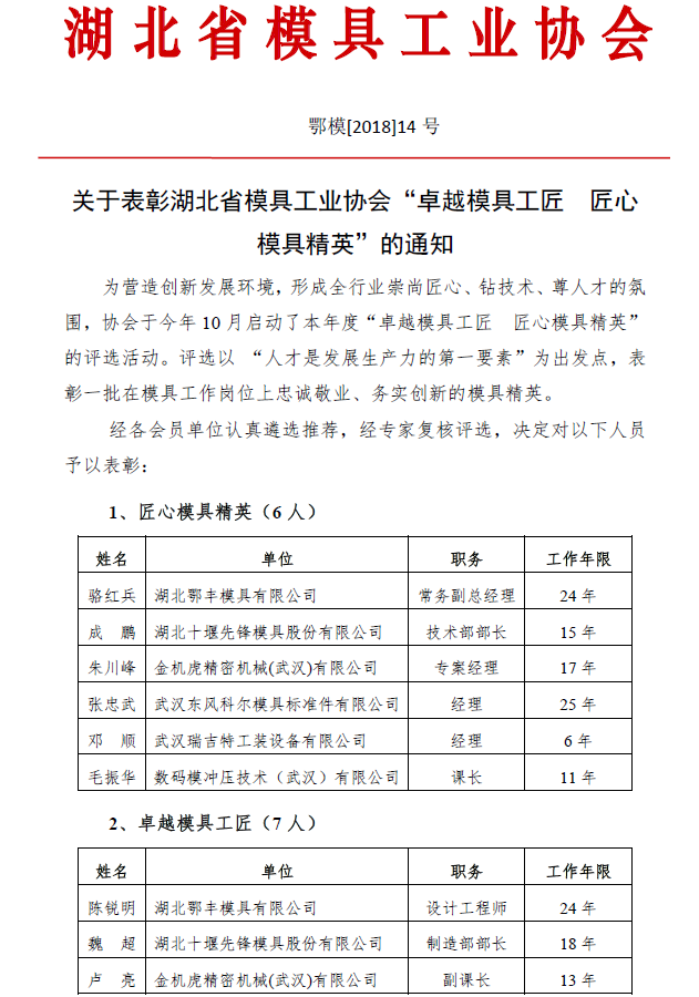 關(guān)于表彰湖北省模具工業(yè)協(xié)會(huì)“卓越模具工匠 匠心模具精英”的通知