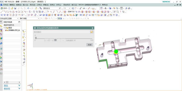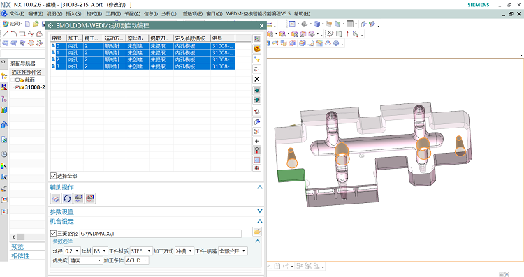 ·自動分析需要進(jìn)行線切割的區(qū)域,通過幾何形狀分類后,自動匹配加工工藝參數(shù)模板,集成常用的線割工藝知識,針對不同機(jī)床生成符合機(jī)床加工的程序代碼;