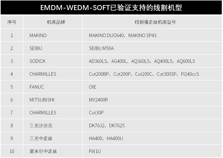 目前可以支持的機(jī)床類型有:日系線割機(jī)床、美系線割機(jī)床、德系線割機(jī)床和國內(nèi)線割機(jī)床。(機(jī)型如下圖)