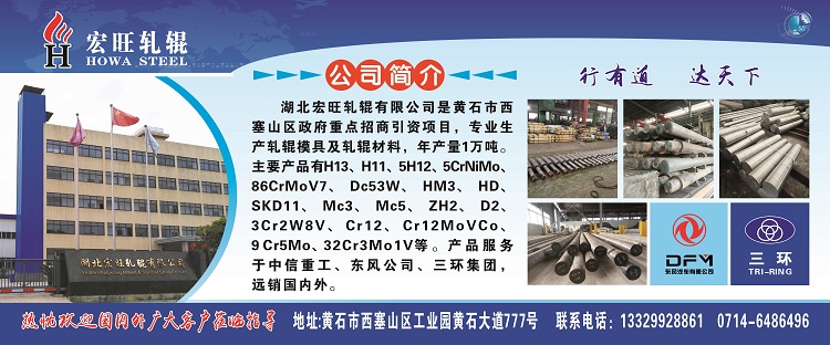 湖北宏旺軋輥有限公司是黃石市西塞山區(qū)政府重點(diǎn)招商引資項(xiàng)目,專業(yè)生產(chǎn)軋輥材料及其它冷、熱作模具材料,年產(chǎn)量1萬噸。主要產(chǎn)品有H13、H11、5H12 、5CrNiMo、86CrMoV7、Dc53W、HM3、HD、SKD11、Mc3、Mc5、ZH2、3Cr2w8v、Cr12、Cr12Mov等。產(chǎn)品服務(wù)于東風(fēng)公司、三環(huán)集團(tuán),遠(yuǎn)銷國內(nèi)外。