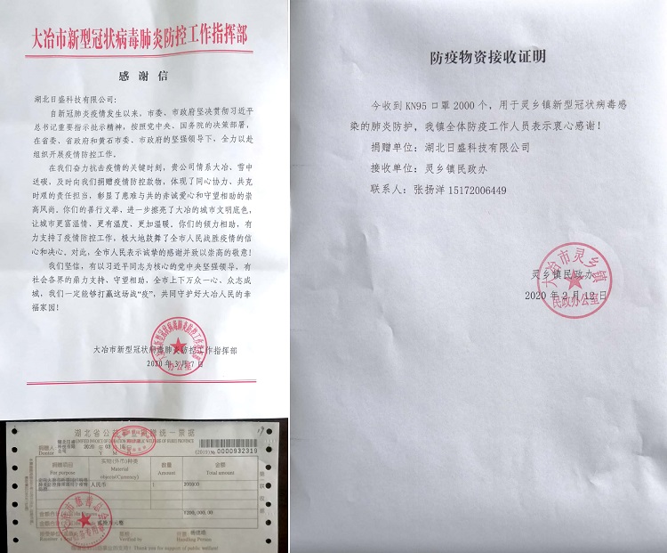 2、2020年2月12日,湖北日盛科技有限公司向大冶市靈鄉(xiāng)鎮(zhèn)民政辦捐贈KN95口罩2000個,向大冶市新型冠狀病毒肺炎防控工作指揮部捐款20萬元。