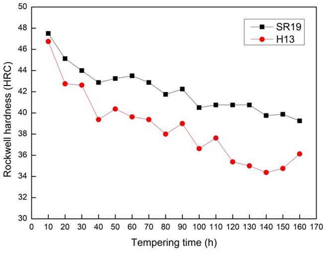 “吳山開,越溪涸,三金合冶成寶鍔。淬綠水,鑒紅云, 五采焰起光氛氳!碧瞥顛沁@樣描寫寶劍的冶煉和熱處理過程。對(duì)于湖北日盛科技有限公司和上海工程技術(shù)大學(xué)的研發(fā)人員來說,年前試制成功的熱沖壓模具鋼SR19(專利號(hào):ZL201910355475.5)就是熱成型高強(qiáng)汽車零部件的“寶劍”。SR19不僅具有高紅硬性(圖1),而且耐磨性遠(yuǎn)超越H13鋼。初次試用于熱擠壓模具,使用壽命比H13鋼提升58%。
