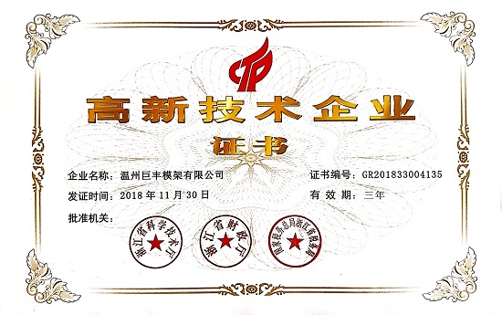 多年來,巨豐模架被認(rèn)定為 “國家高新技術(shù)企業(yè)、溫州市技術(shù)研究開發(fā)中心、守合同重信用AAA級企業(yè)、安全生產(chǎn)標(biāo)準(zhǔn)化企業(yè)”。通過了“ISO9001:2008國際質(zhì)量體系、兩化融合管理體系”認(rèn)證,先后獲得“浙江省科技型企業(yè)、模具行業(yè)優(yōu)秀供應(yīng)商、模具行業(yè)優(yōu)秀會員”等榮譽(yù)稱號。