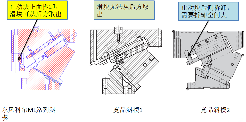 上置式斜鍥有滑塊止動(dòng)裝置,可從底座正面進(jìn)行拆卸,盡量減少需要的拆卸空間,實(shí)現(xiàn)滑塊從后側(cè)取出。
