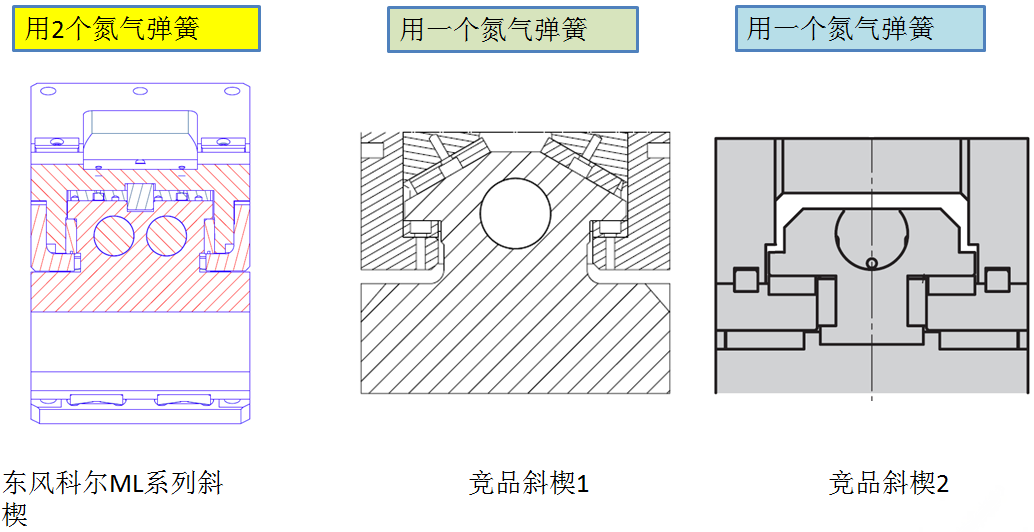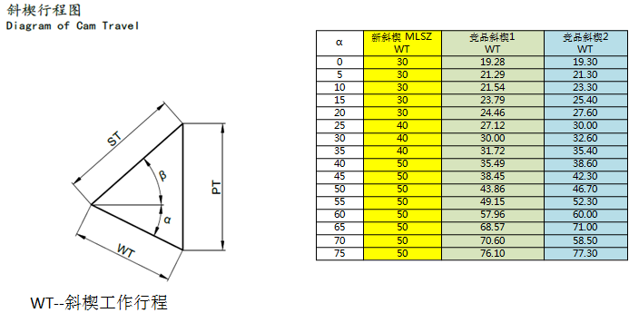 相同安裝面寬度斜楔,安裝面高度高于其它競(jìng)品斜楔,斜楔長(zhǎng)度比其它斜楔短,為模具節(jié)省空間。