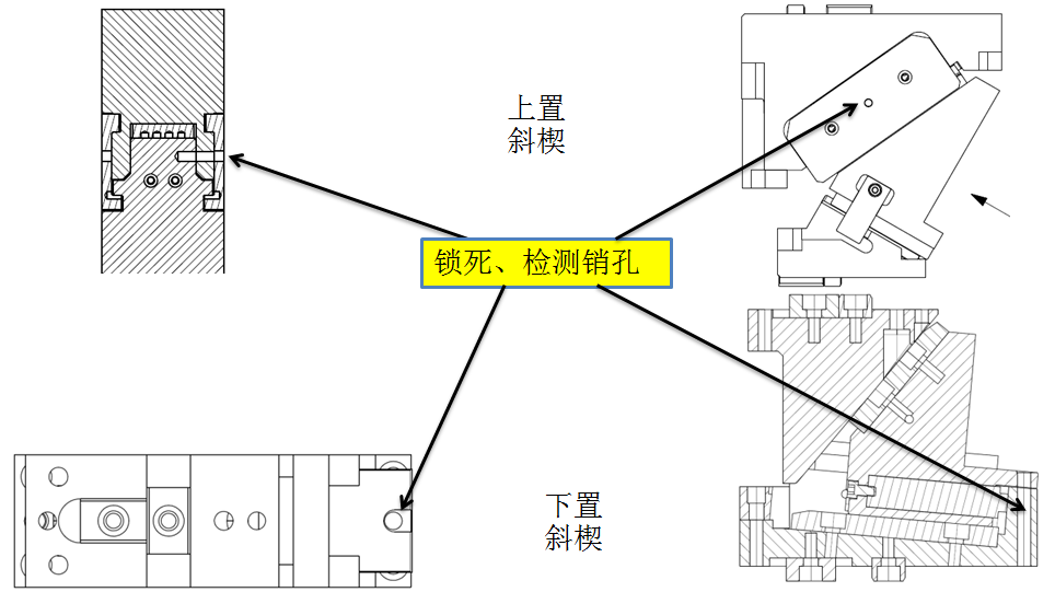 斜楔下死點(diǎn)側(cè)銷(xiāo)釘定位鎖死滑塊,兼具測(cè)量檢驗(yàn)功能;