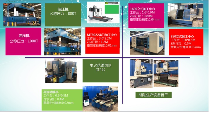 3022龍門加工中心一臺,1690立式加工中心一臺,850立式加工中心一臺,800T油壓機(jī)一臺,600T油壓機(jī)一臺,500Z行程平面磨一臺,中絲線切割機(jī)一臺,快絲線切割機(jī)若干,數(shù)控車床設(shè)備若干,其它輔助生產(chǎn)設(shè)備若干(鉆床、小型打磨機(jī)、焊機(jī)等)。