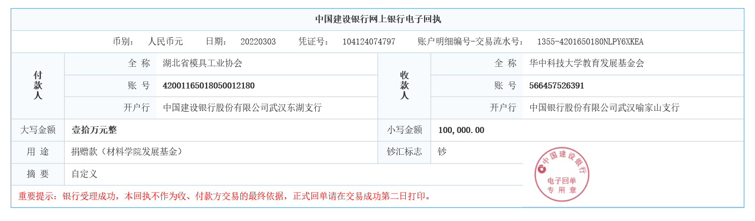 2022年2月下旬,梁培志秘書長代表湖北模協(xié)與;饡炗喠司栀泤f(xié)議,該款項已于3月3日足額轉(zhuǎn)入“華中科技大學教育發(fā)展基金會”賬戶。