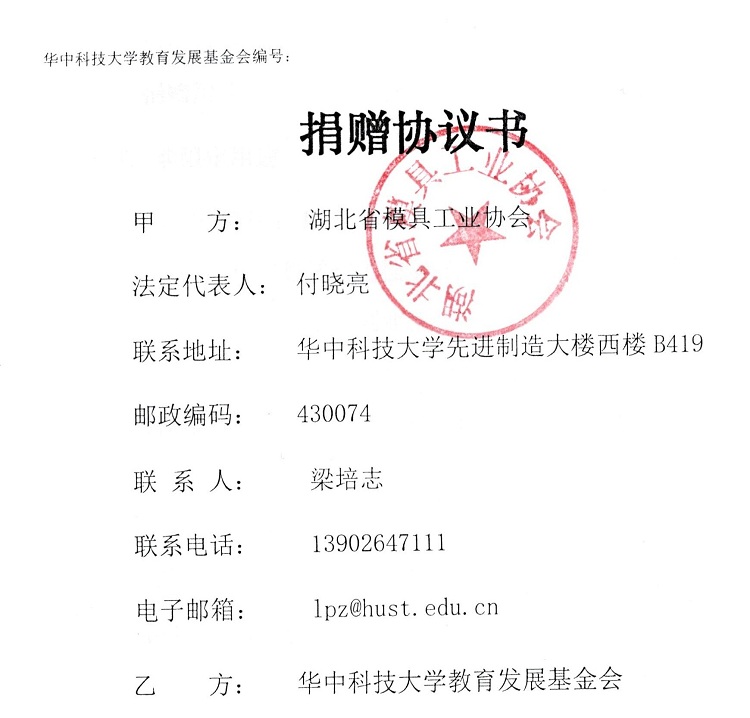為了表示對華中科技大學特別是材料學院舉辦70年慶典的祝賀之意和感恩之情,經(jīng)湖北省模具工業(yè)協(xié)會第五屆會長付曉亮先生批準,協(xié)會秘書處向材料學院發(fā)展基金定向捐贈10萬元。湖北省模具工業(yè)協(xié)會于1987年由湖北省人民政府批準成立,是全國較早成立的省級模具協(xié)會之一,現(xiàn)有正式會員單位近190家。目前,湖北十堰先鋒模具股份有限公司為第五屆會長單位,華中模具城等12家單位任副會長單位,華中科技大學材料學院梁培志老師任秘書長,協(xié)會秘書處設(shè)在華中科技大學材料成形與模具技術(shù)國家重點實驗室大樓內(nèi)。