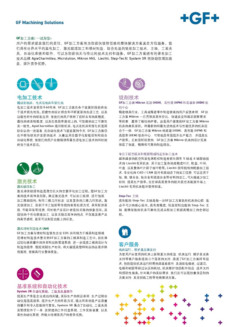 精確、高速和可靠的瑞士GF加工方案集團(tuán)的產(chǎn)品為我們客戶的成功起到推動(dòng)作用。在我們產(chǎn)品的整個(gè)生命周期中,提高的生產(chǎn)力和降低的運(yùn)行成本意味著為我們的客戶創(chuàng)造更大的價(jià)值。