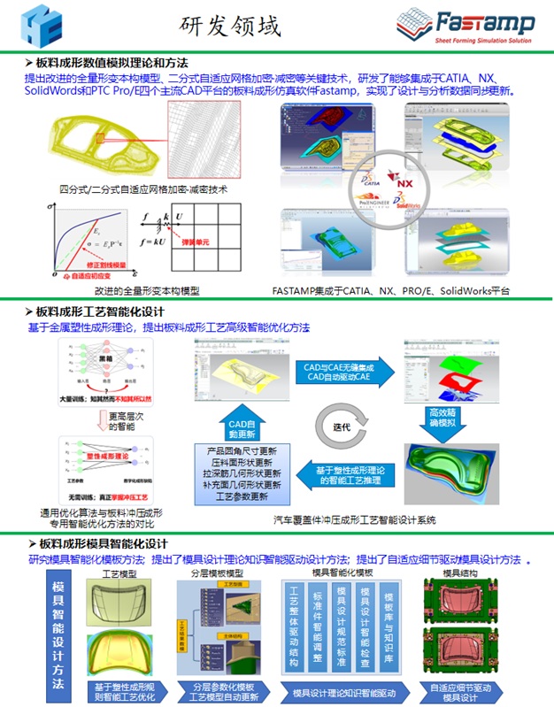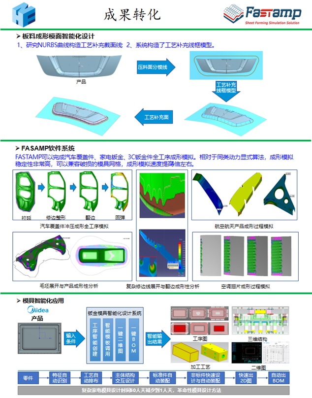 公司現(xiàn)為板料成形與模擬軟件FASTAMP產(chǎn)品的總代理。FASTAMP系列軟件,是唯一一款由國內(nèi)自主研發(fā)并擁有完全知識產(chǎn)權(quán)的專業(yè)金屬板料成形仿真系統(tǒng)。目前已經(jīng)申請了14項軟件著作權(quán),并在國內(nèi)主流汽車與模具企業(yè)得到了廣泛應(yīng)用,主要客戶包括奇瑞汽車、江淮汽車、上海大眾、廣州本田、一汽模具、上海賽科利、成飛集成、東風(fēng)模沖、天汽模及奇瑞瑞鵠等一線汽車與模具企業(yè)。